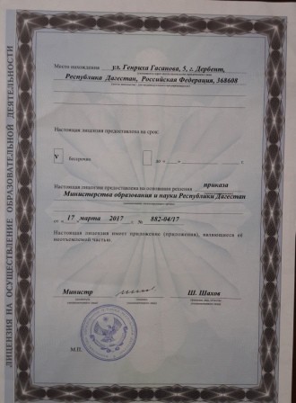 Адрес местонахождения образовательной организации* 368600, Республика Дагестан, г. Дербент, ул. Г. .Гасанова, 5а